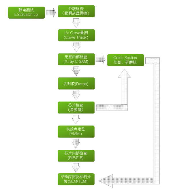 半導(dǎo)體器件的失效分析流程,國(guó)際國(guó)內(nèi)公認(rèn)的方法是從非破壞性試驗(yàn)手段到破壞性試驗(yàn)手段